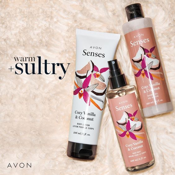 - Come to your senses. Avon Senses body lotions are designed to provide your skin with 30 hours of moisture while giving skin a healthy and velvety smooth appearance. Opt for Avon Senses Sparkling Grapefruit and Orange Blossom for an uplifting citrus scent, Avon Senses Cozy Vanilla & Coconut for an indulgent, comforting experience, or Avon Senses Fresh Bergamot and Wild Mint for a light and refreshing feel.