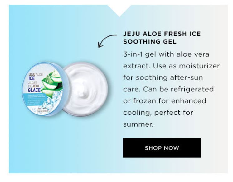 Then, give skin a refresh with Jeju Aloe Fresh Soothing Mist, an instantly cooling and soothing facial mist with 90% aloe vera extract. Featuring antioxidant ingredients, enzymes, and vitamins A and C, it helps calm, soothe and soften irritated skin.