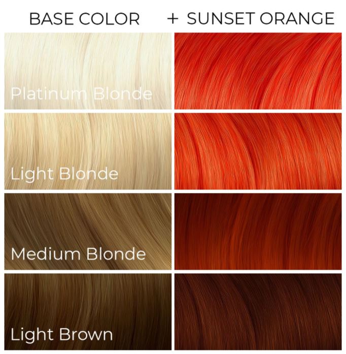 Is it hot in here or is it just you?! Sunset Orange is a fiery, deep red-orange that turns out well on a more medium blonde! Brassy tones won’t cause any problems for this color. Since it’s primarily red-based, the red undertones of Sunset Orange may come through more strongly on hair that is more of a light blonde, around a level 9 or lighter.