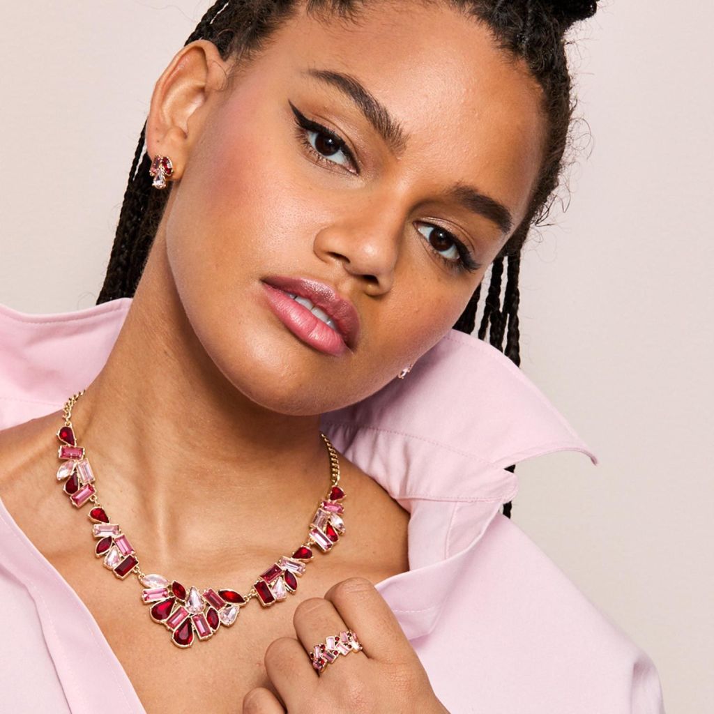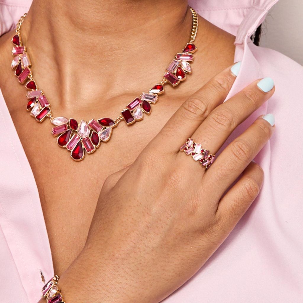 Show off the glamorous look of rubies and pink tourmaline. You’ll love this rosy statement set, crafted with shades of red and pink baguette stones set in gold tone.