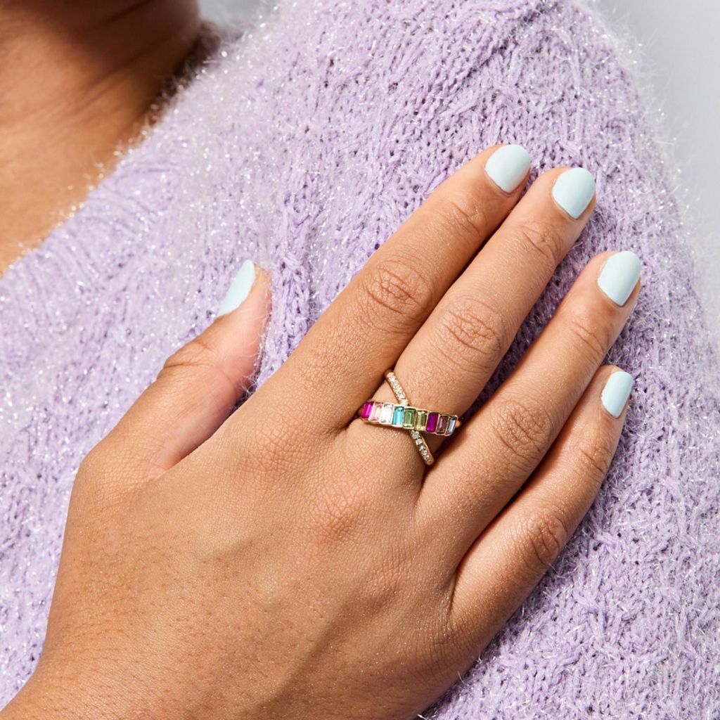Embrace a full spectrum of colors with this shimmering statement ring, complete with a unique crossover.