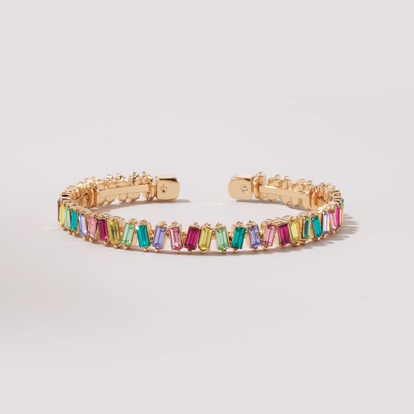 Embrace a full spectrum of colors with this shimmering cuff bracelet, featuring rainbow-colored baguette stones set in gold tone.