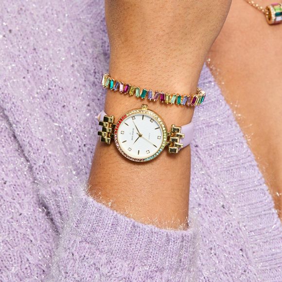 Embrace a full spectrum of colors with this dreamy pastel timepiece, crafted with a lavender leather-like strap and rainbow-colored stone accents set in goldtone.