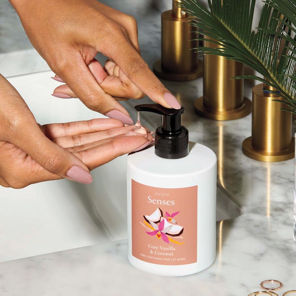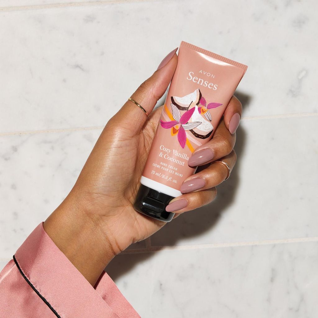 Our hands are always busy. There’s no other part of the body we use more. Help your hands feel exquisitely cared for with new luxuriously scented pump soaps and hand creams use Avon Senses Cozy Vanilla & Coconut Hand Cream.