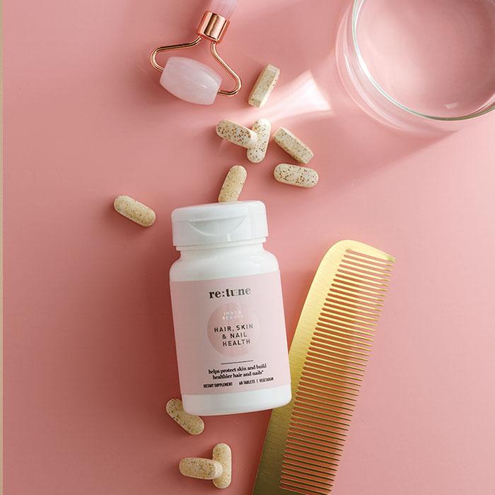 Help protect skin while building healthier hair and nails with re:tune Inner Beauty Hair, Skin & Nail Health, complete with antioxidants, biotin and nutritional building blocks to promote a healthy response to UV exposure.