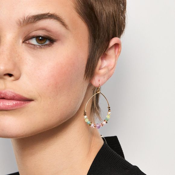 Crafted with a bouquet of dreamy multicolored beads and pearl accents set in gold tone, these hoop earrings are pastel perfection.