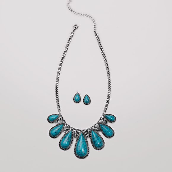 Crafted of striking reconstituted turquoise stones in an antiqued setting, this highly detailed necklace and earring set channels vintage vibes.