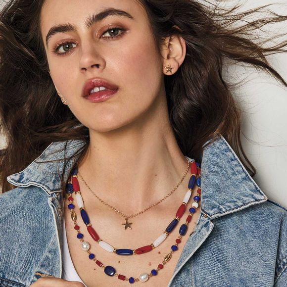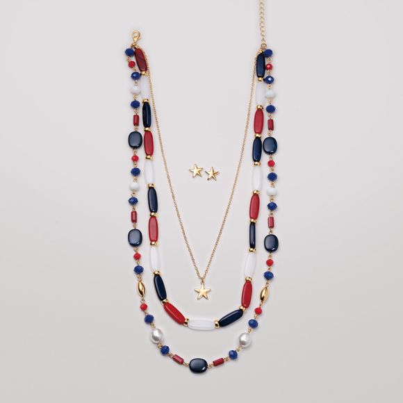 A bold necklace and earring set imbued with patriotic charm in red, white and blue colors. The 3-row necklace combines two longer chains with colored and pearlesque beads and a short goldtone chain with a charming star pendant.