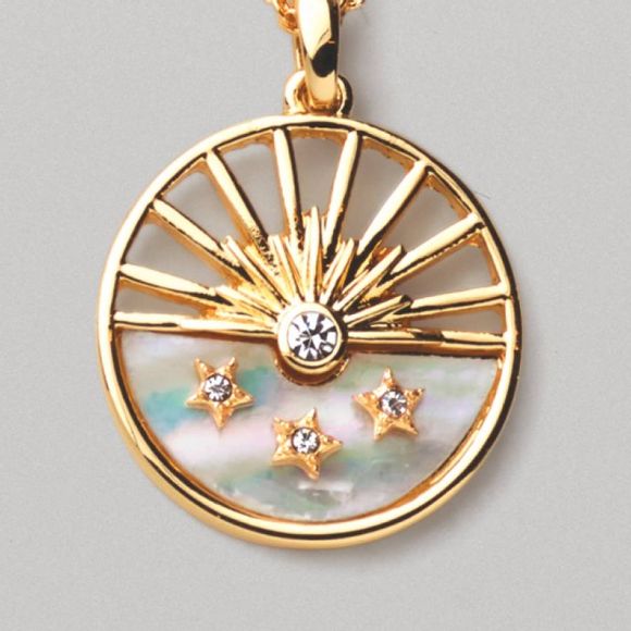 You’ll radiate style in a celestial necklace with a cosmic motif crafted of glowing mother-of-pearl plus sparkling accents set in goldtone.