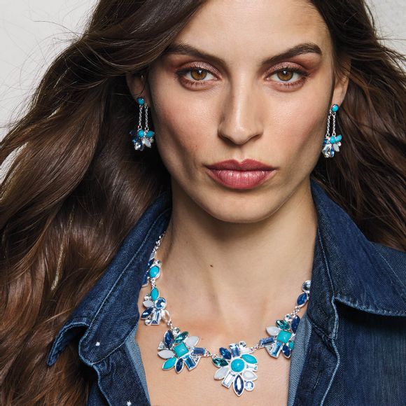 Look what’s blooming! Necklace and earring set gathers clusters of flowers in bold, bright blues set in silvertone. Wear together as a set or mix for a pop of color.