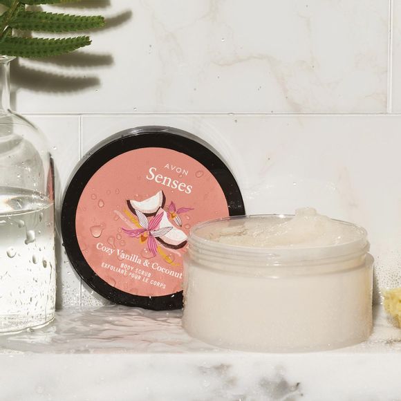 Revitalize your skin with the inviting scent of vanilla and creamy coconut with this gentle body scrub. The Avon Senses Cozy Vanilla & Coconut Body Scrub removes dry, dead skin while shea butter, olive oil, and avocado oil help to moisturize. This pampering formula leaves your skin feeling soft and smooth, making it the perfect addition to your bath routine.