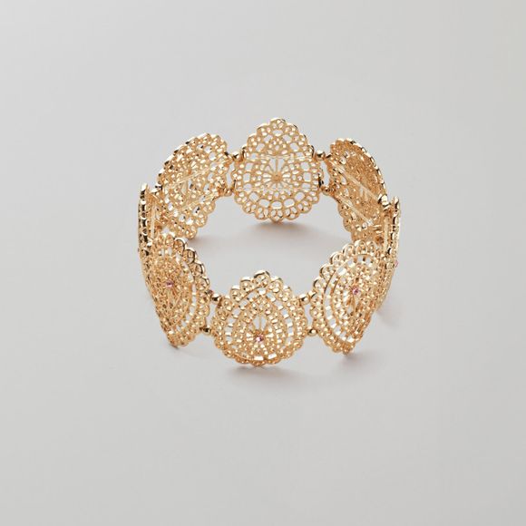 A statement-making stretch bracelet that draws inspiration from ancient Egyptian jewelry. A row of pear-shape filigree designs is adorned with light rose accent glass stones and set in lustrous goldtone.