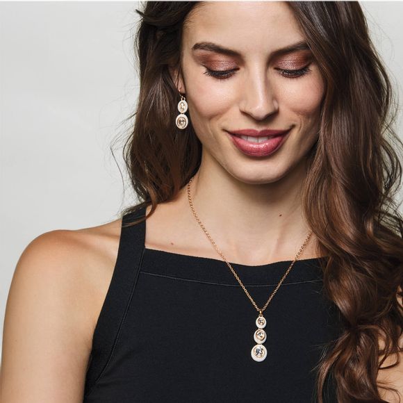 The look of vintage and the charm of rose-colored stones in a three-row necklace. The longest chain is adorned with a pear-shape filigree pendant with light rose accent glass stones while the shorter chains feature textured elements. Matching earrings also available.