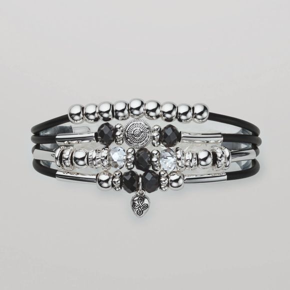 Strike an effortlessly cool, boho look with a multilayered cord bracelet with antiqued silvertone beads and textured accents.
