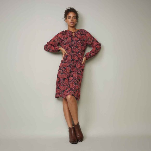 Start your look with this charming Paisley Print Dress—a perfect blend of everyday comfort and statement-making style. The paisley pattern adds a fun, eye-catching element that’s sure to brighten up your wardrobe. With a tie neckline and long sleeves featuring elastic cuffs, this dress is as practical as it is stylish. Whether you’re headed to brunch, a casual date, or just enjoying a day out, the flattering silhouette and back zip closure make it easy to wear all day long. Pair it with a leather jacket or a cozy cardigan if the weather calls for layers.