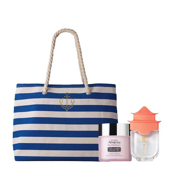 This bundle also includes the Nautical Stripe Tote, a classic blue-and-white-striped canvas bag with a charming gold anchor print. The tote is both stylish and practical, making it a great accessory for a beach day or a weekend getaway. Together, these items offer a balanced blend of fragrance and beauty, creating an uplifting experience that inspires confidence and vitality.
