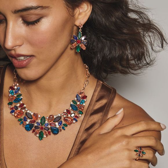 For a vibrant splash of color, the Gemstone Glamour Statement Necklace brings together an array of jewel-toned glass stones clustered beautifully with clear stones. Set in goldtone, this necklace is an instant showstopper and ideal for those who aren’t afraid to embrace bold color and sparkle.