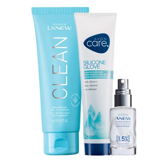 Hydrate and protect your skin with the Hydrating Hand & Face Set. Featuring the Anew Hydra Fusion 1.5% Hyaluronic Acid Serum, Isa Knox LXNEW Clean Balancing Gel Cleanser, and Avon Care Silicone Glove Protective Hand Cream, this bundle keeps your skin soft, smooth, and hydrated no matter the season.