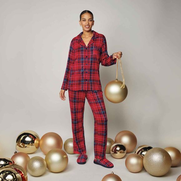 Nothing says Christmas quite like plaid! The Plaid 2-Piece PJ Set is perfect for those cozy nights by the fireplace or lazy mornings sipping coffee. This red plaid set is made from a soft knit material with a polished look, featuring a notched collar, button-front placket, and cuffed long sleeves. The matching bottoms have an elastic waistband for maximum comfort.